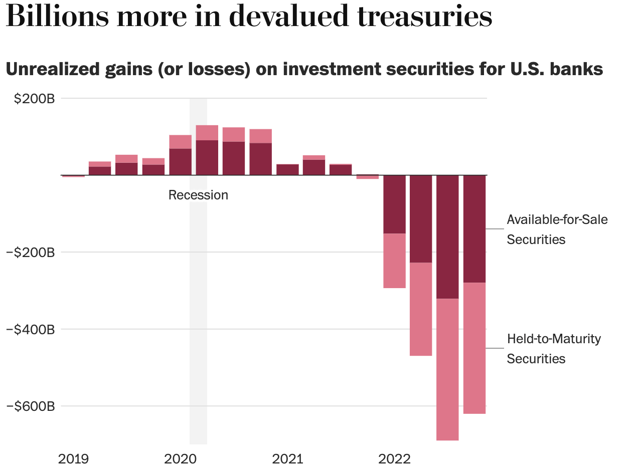 2. The financial sector needs to reconsider the unrealized potential of depreciating bonds. U.S. banks are sitting on a staggering $620 billion in unrealized losses, according to the FDIC on the graph to the left. The problem only continues to deepen as short term solutions to this problem continue to arise.